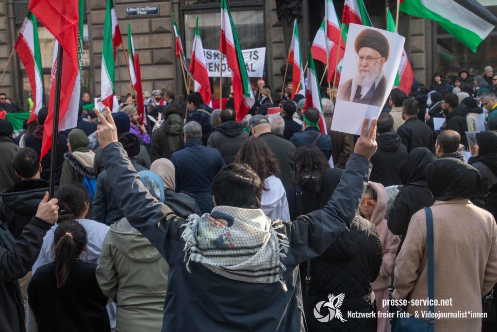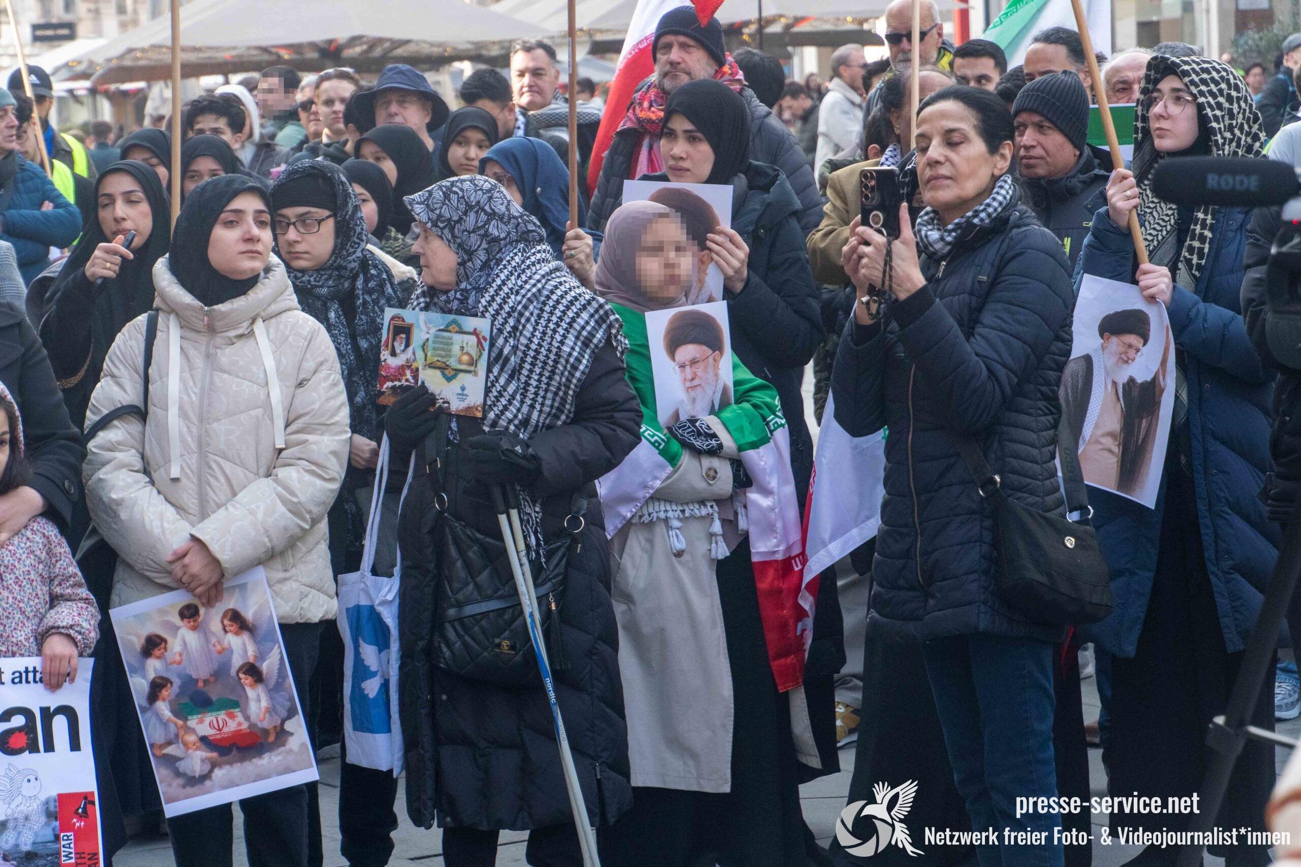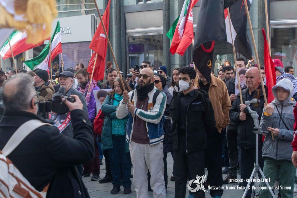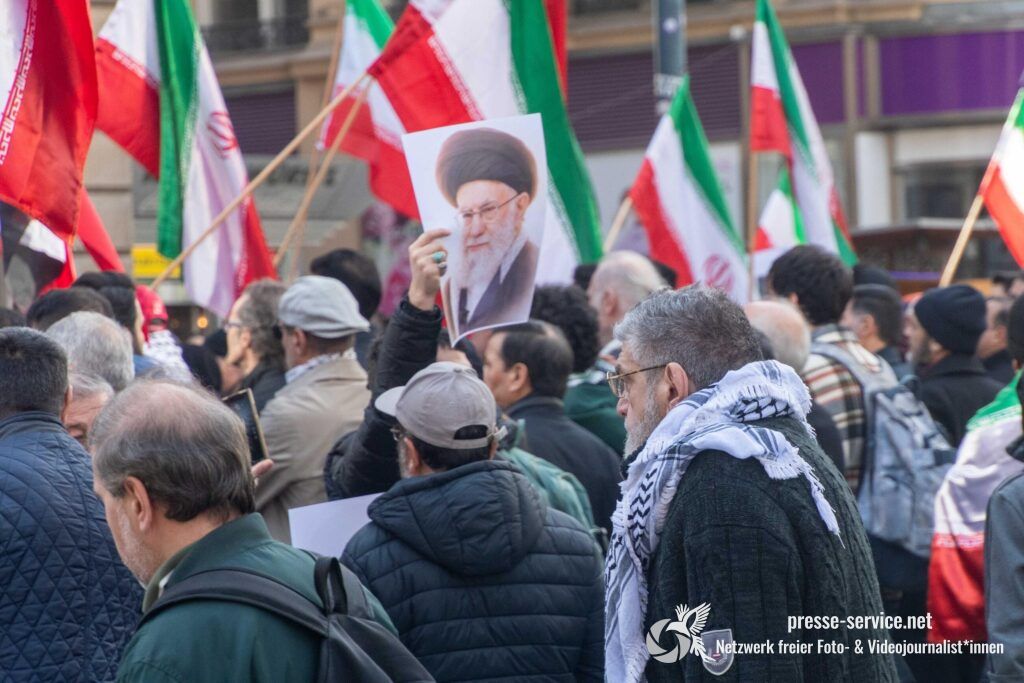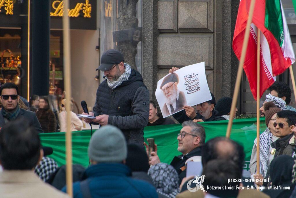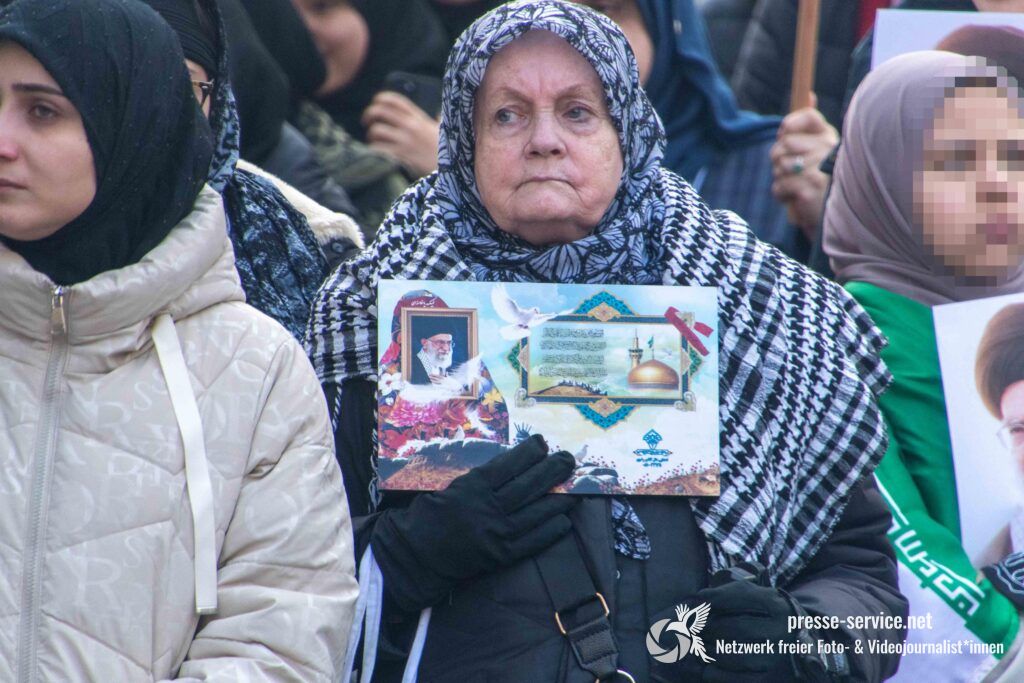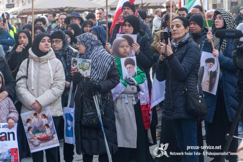 Auf der Kundgebung waren Fahnen der Islamischen Republik Iran sowie Portraits des am 28.02.2026 getöteten obersten Führers der Islamischen Republik Iran Ali Khamenei allgegenwärtig.