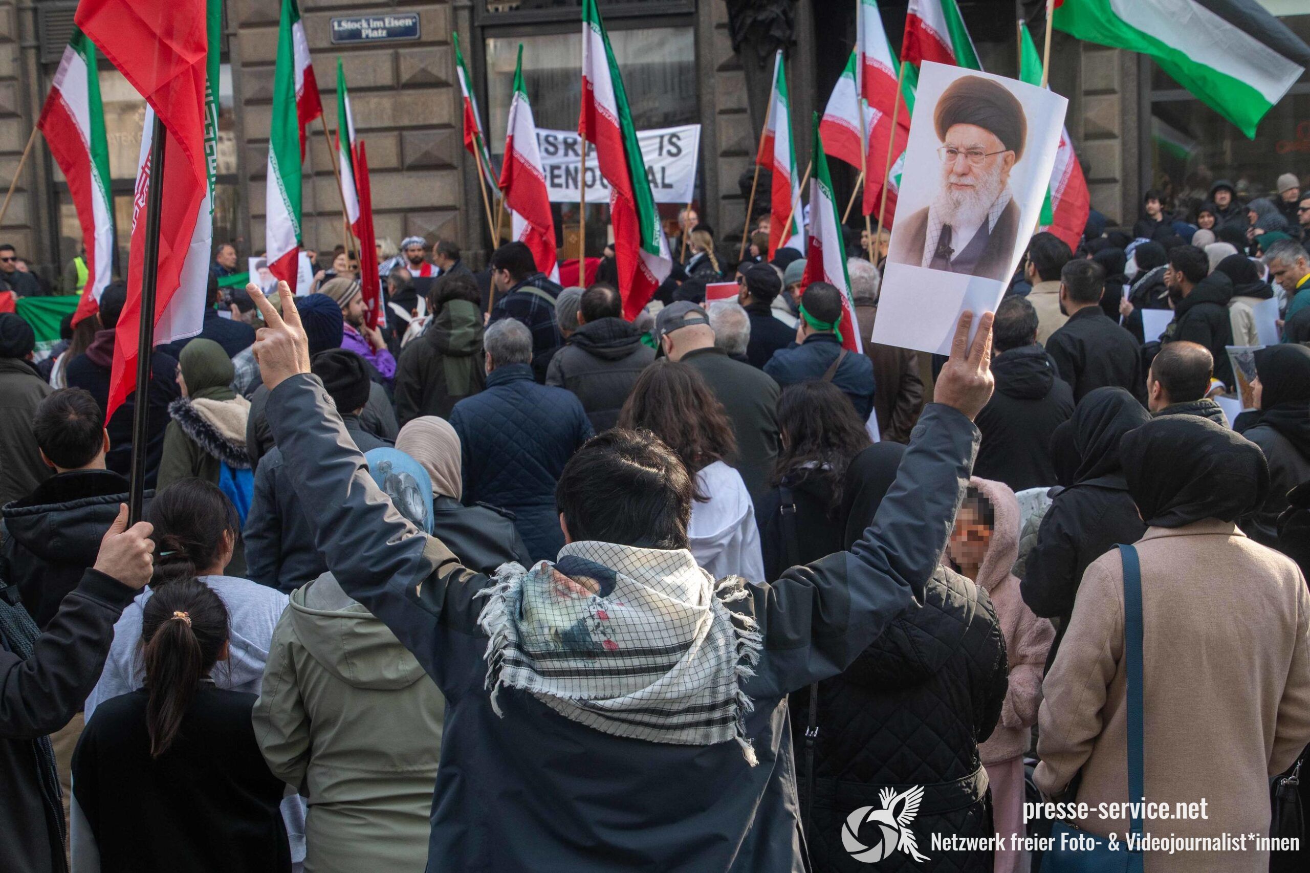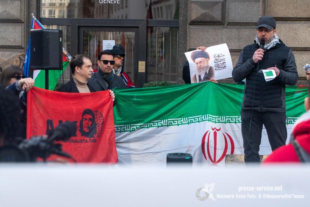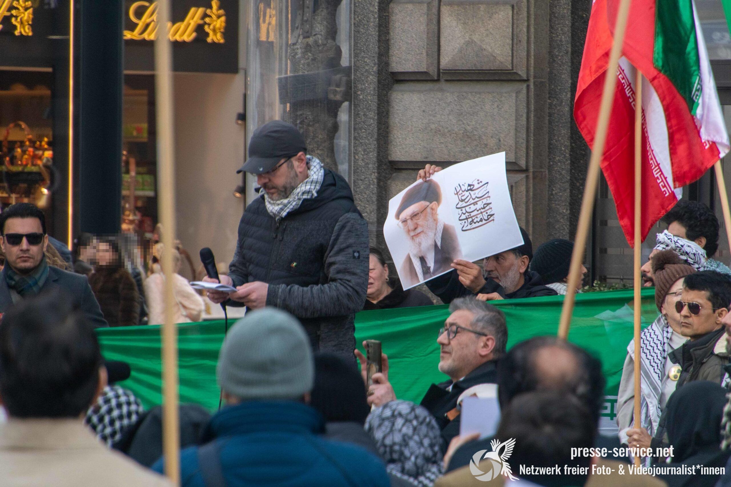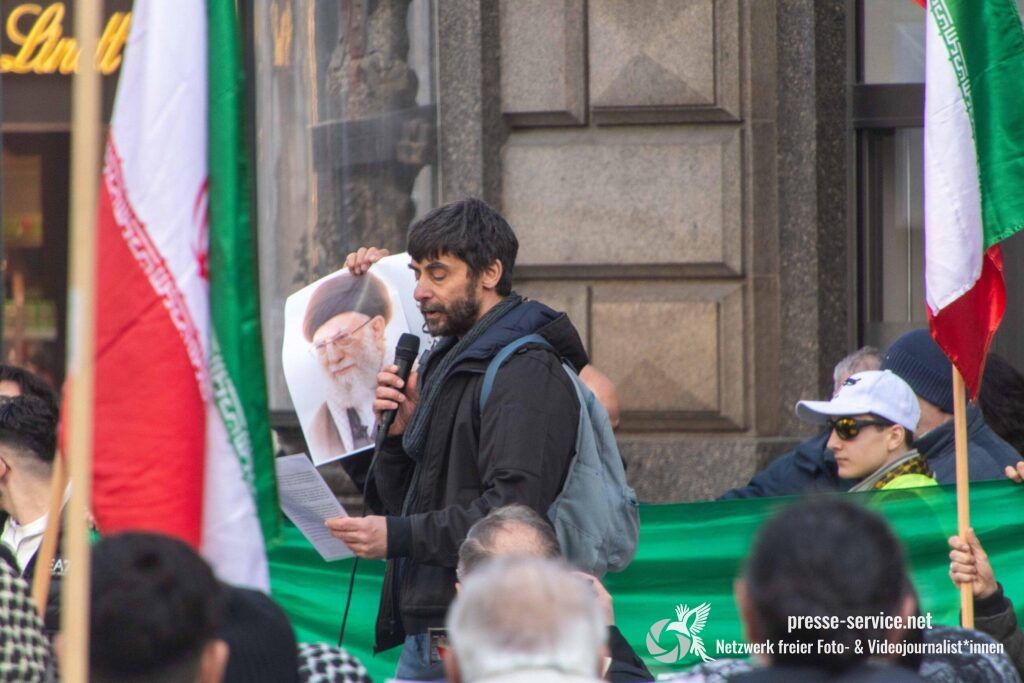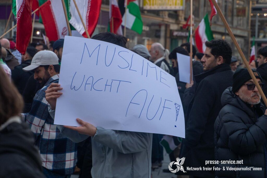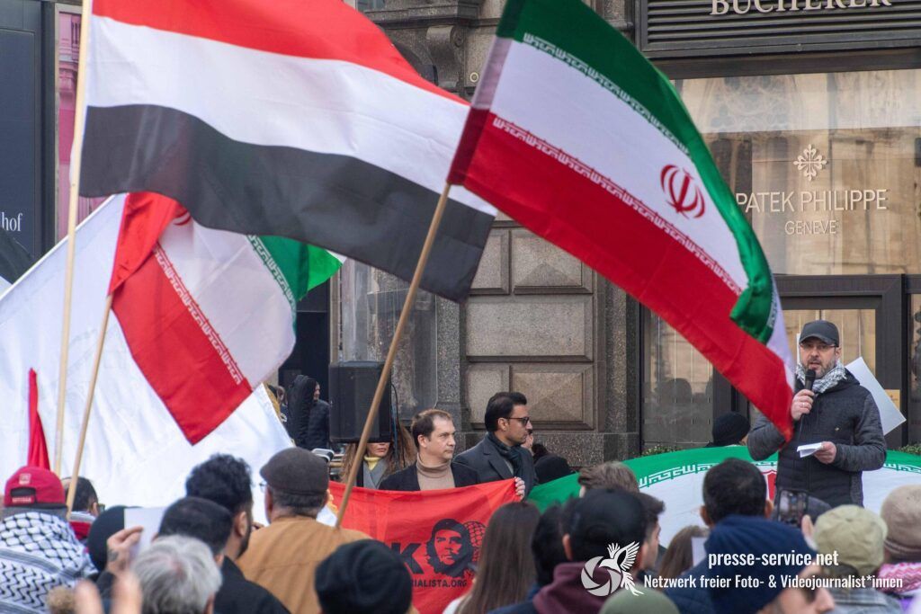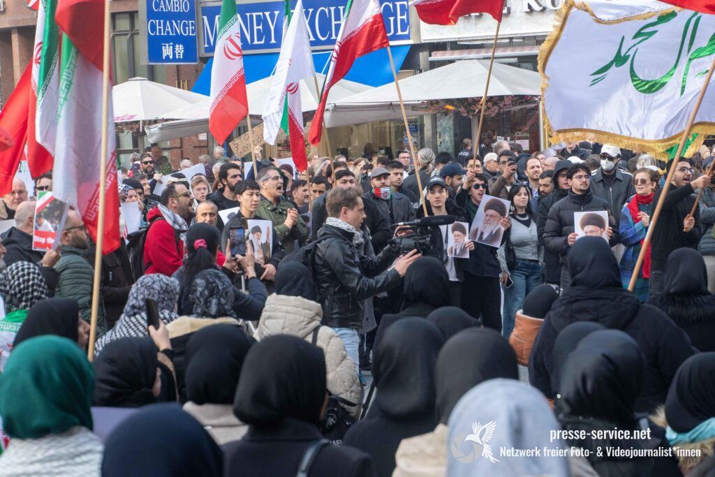 Auf der Kundgebung waren Fahnen der Islamischen Republik Iran sowie Portraits des am 28.02.2026 getöteten obersten Führers der Islamischen Republik Iran Ali Khamenei allgegenwärtig.