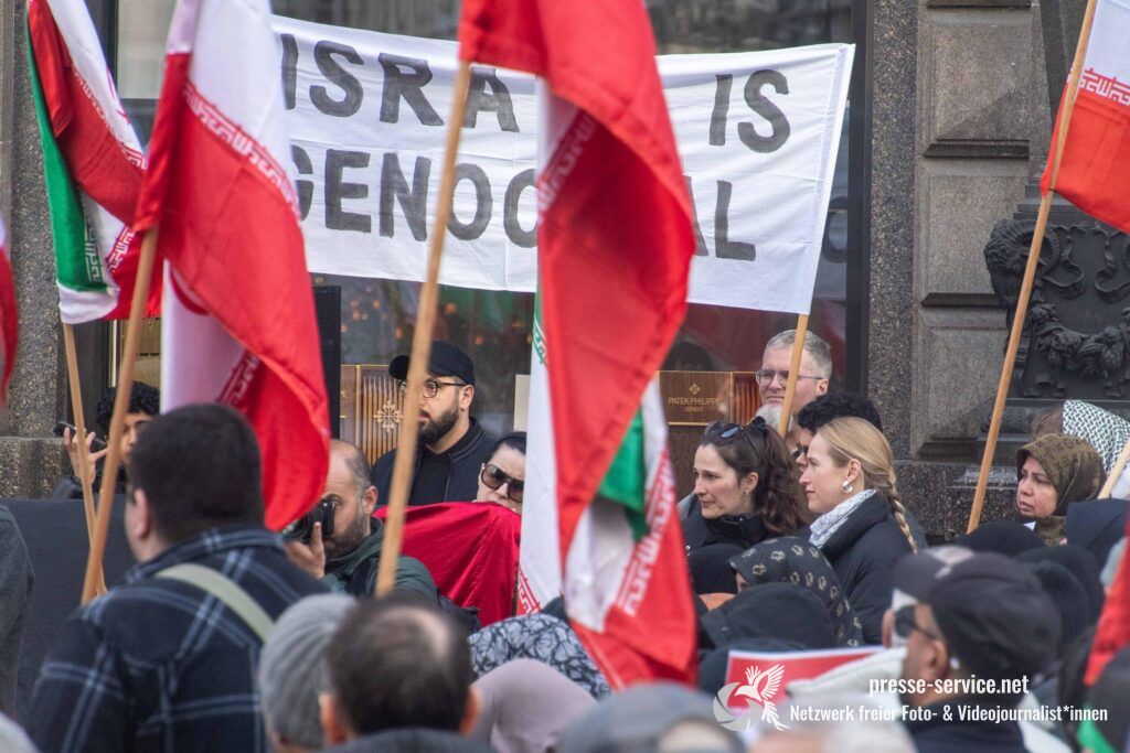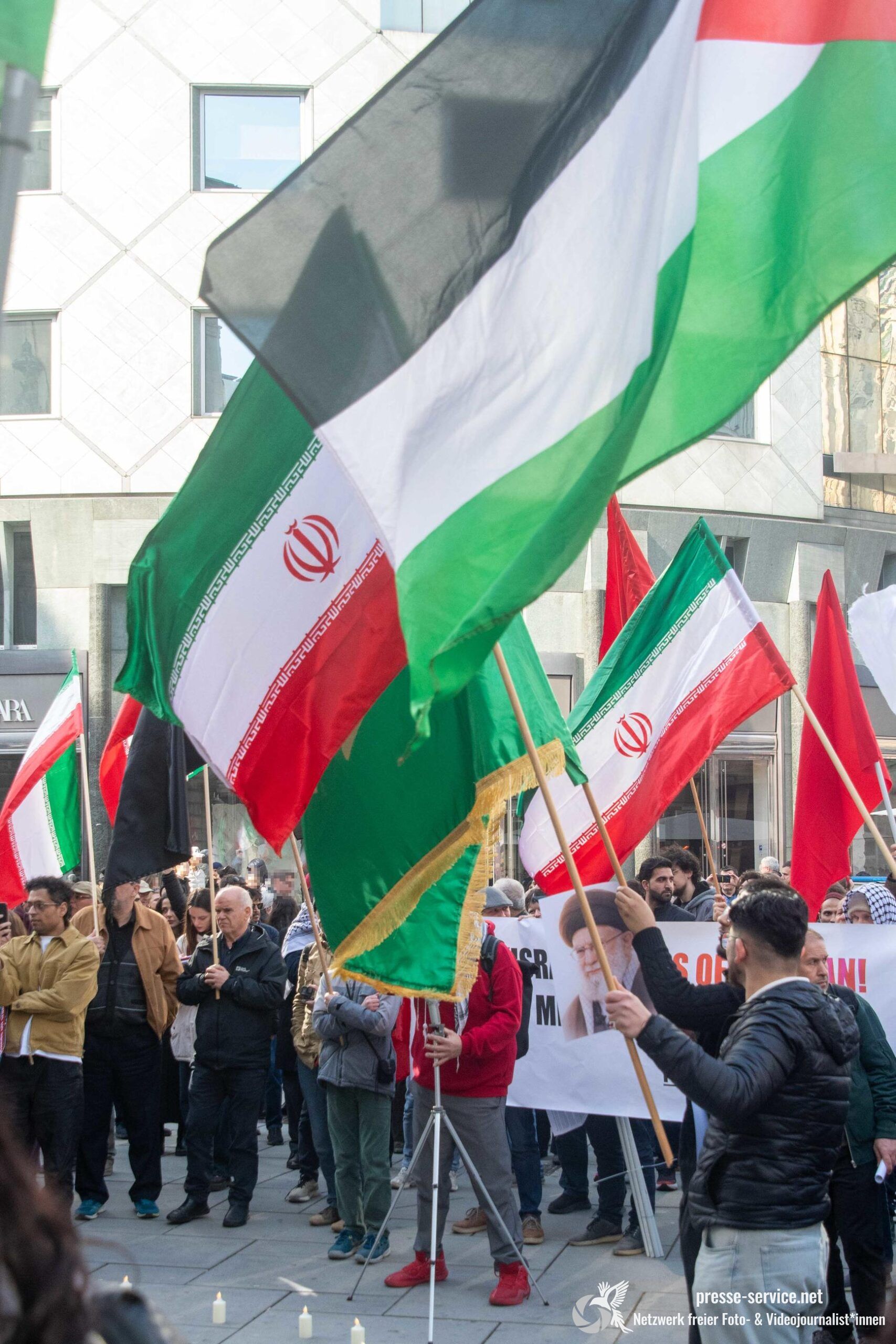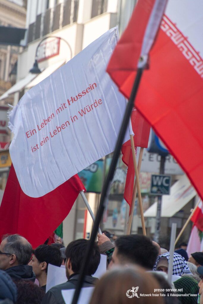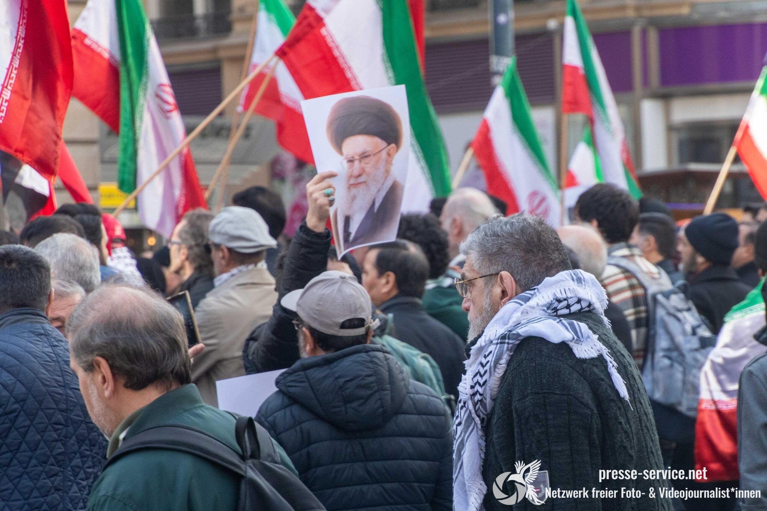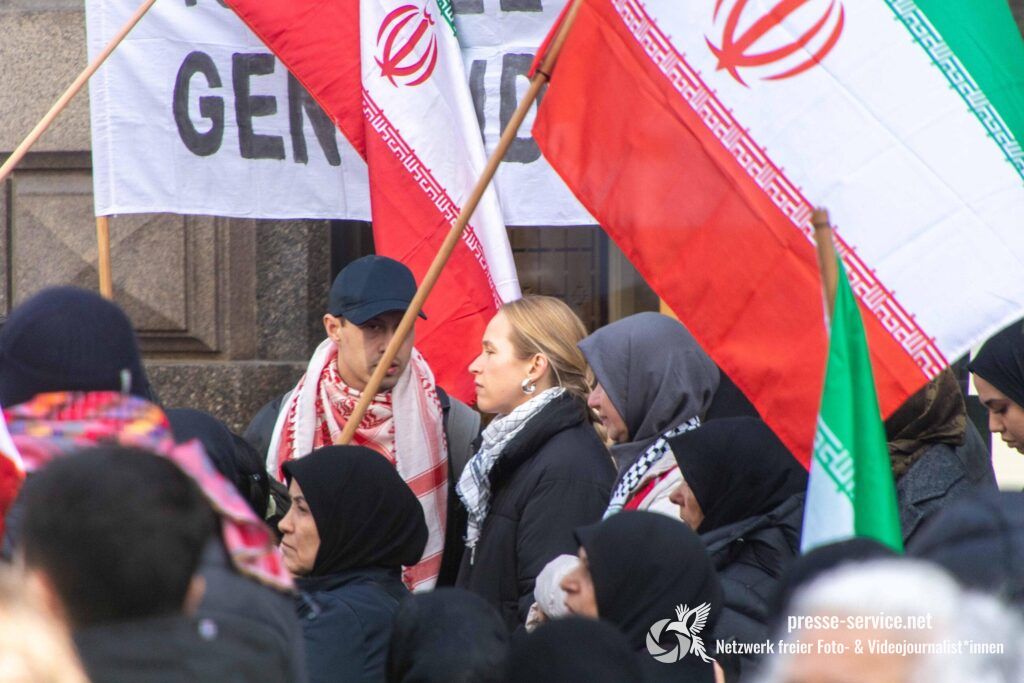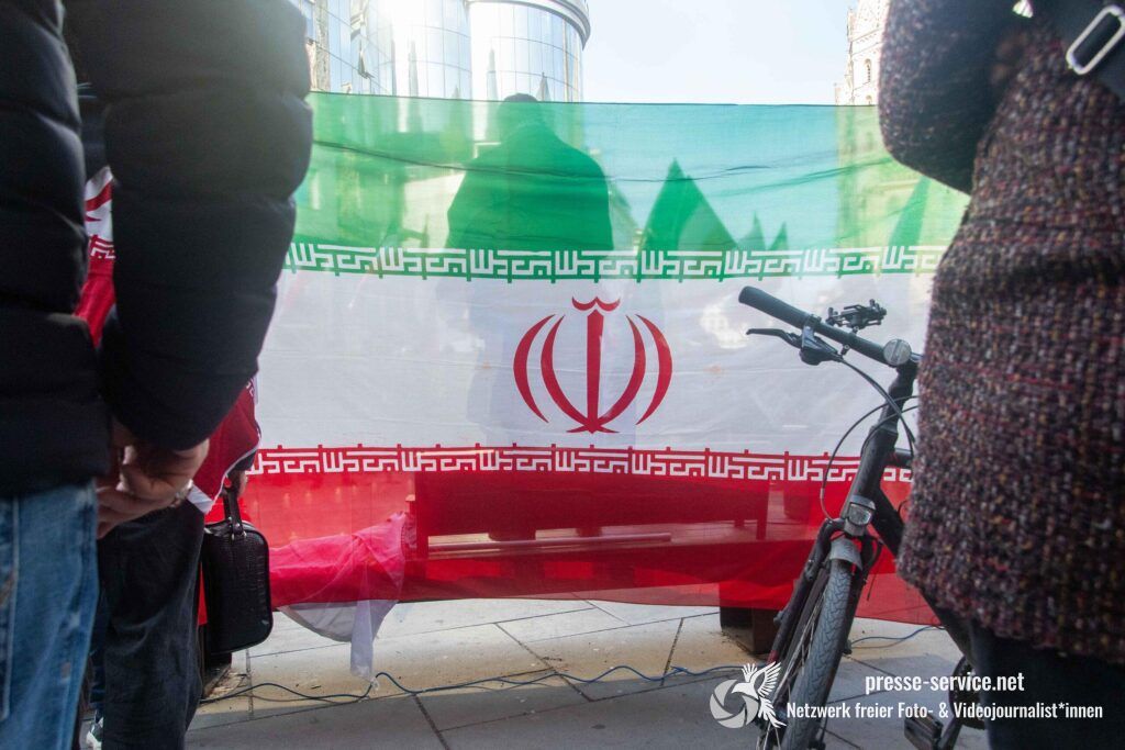 Auf der Kundgebung waren Fahnen der Islamischen Republik Iran sowie Portraits des am 28.02.2026 getöteten obersten Führers der Islamischen Republik Iran Ali Khamenei allgegenwärtig.
