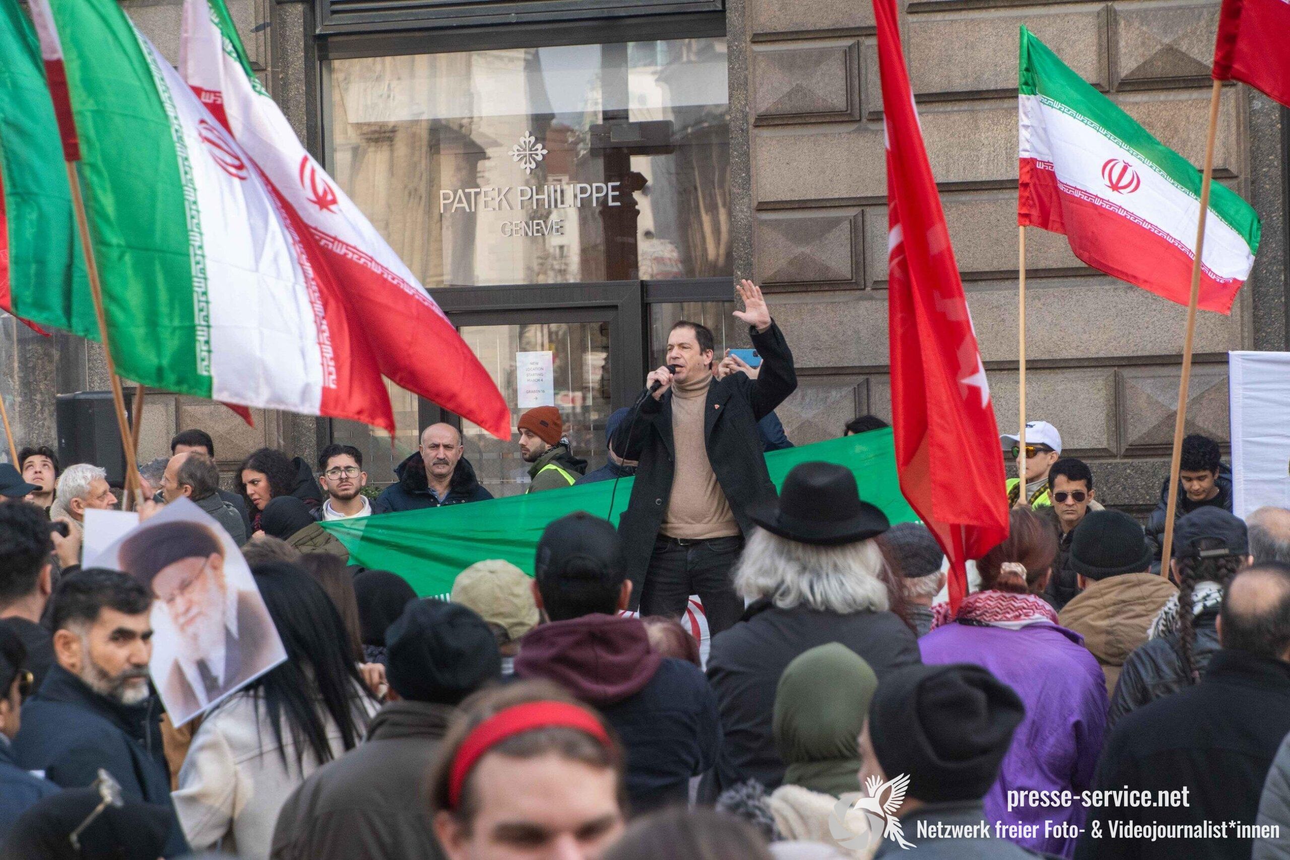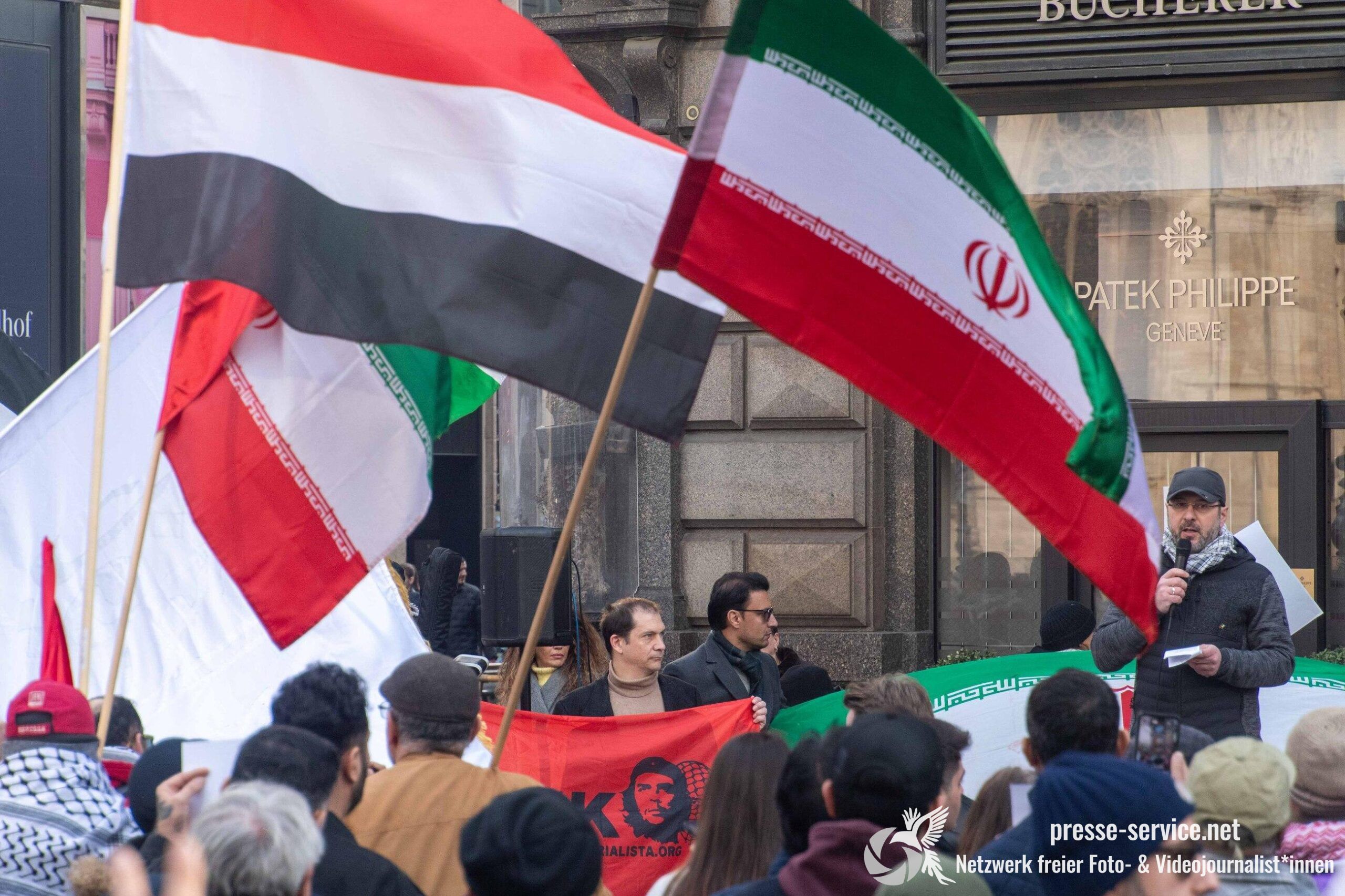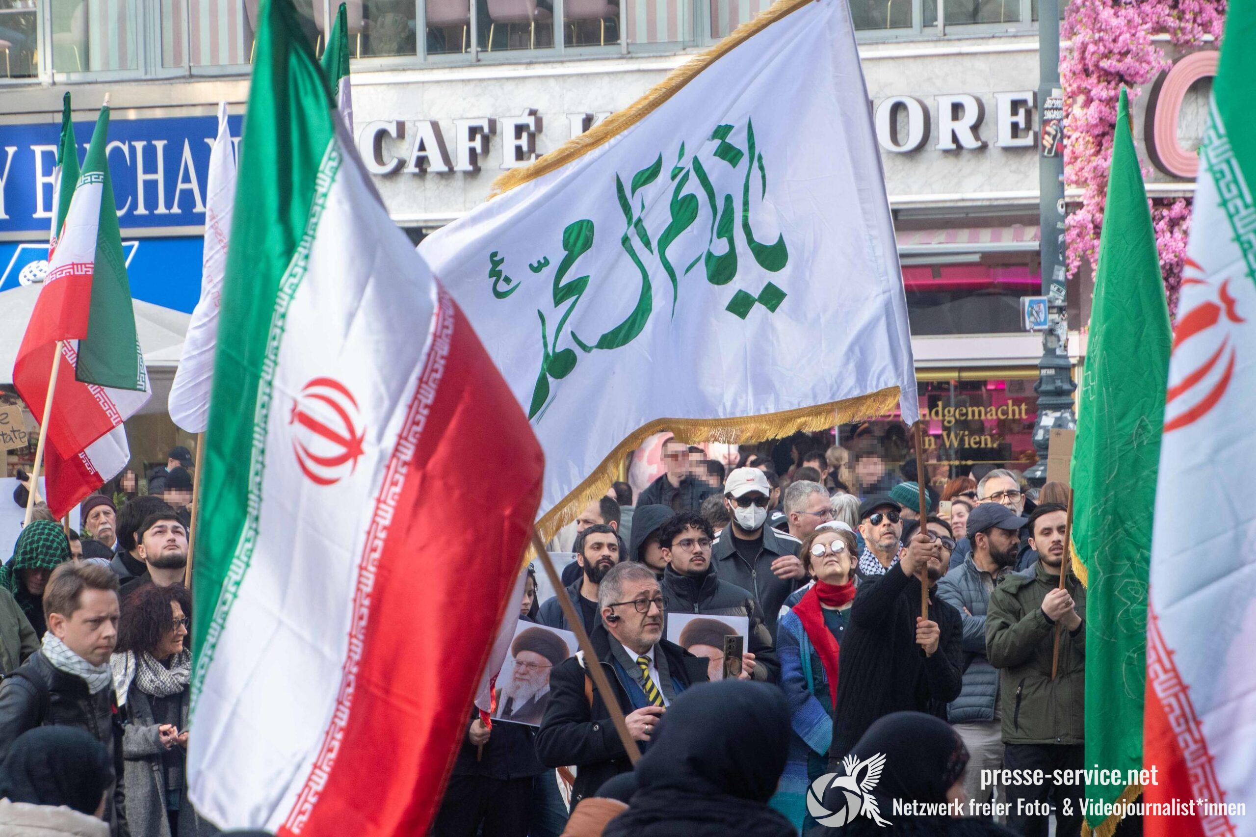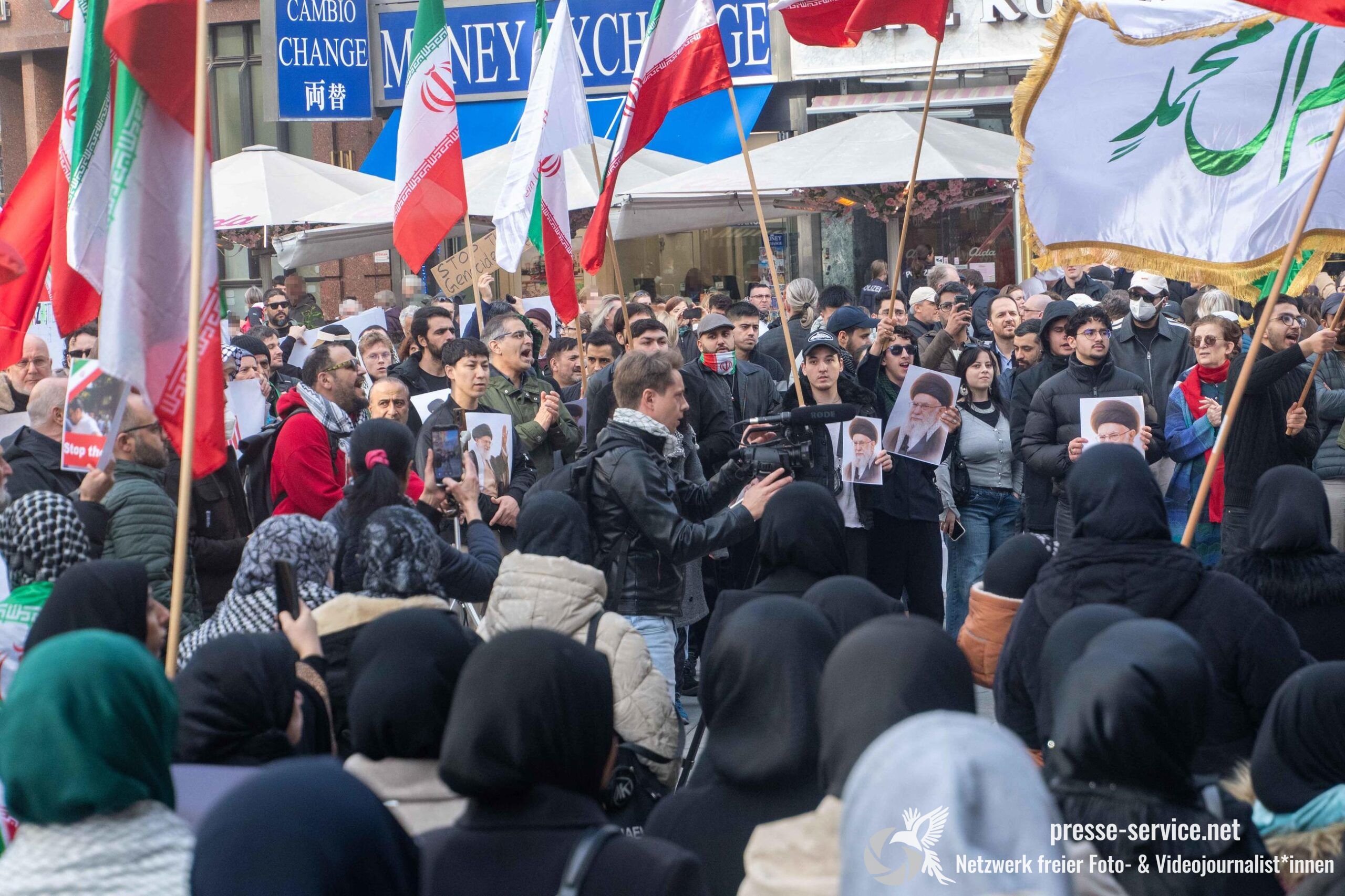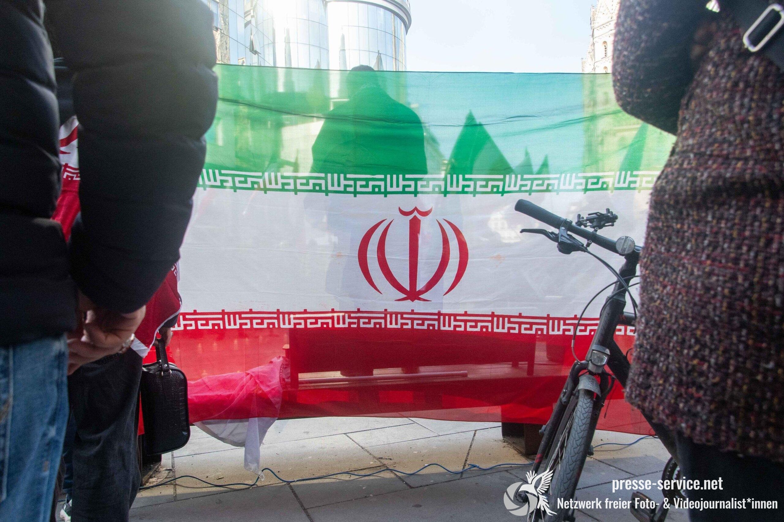 Auf der Kundgebung waren Fahnen der Islamischen Republik Iran sowie Portraits des am 28.02.2026 getöteten obersten Führers der Islamischen Republik Iran Ali Khamenei allgegenwärtig.