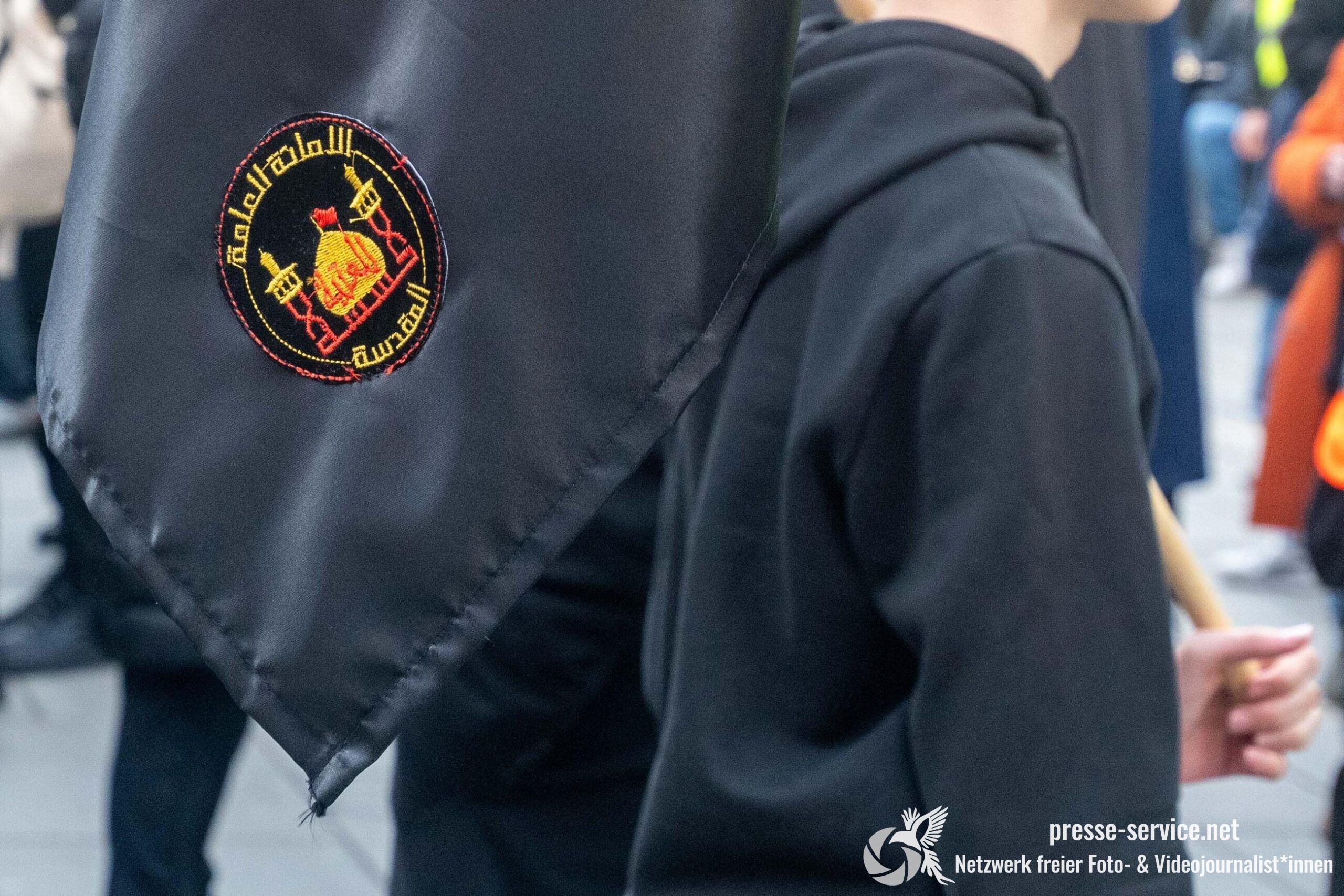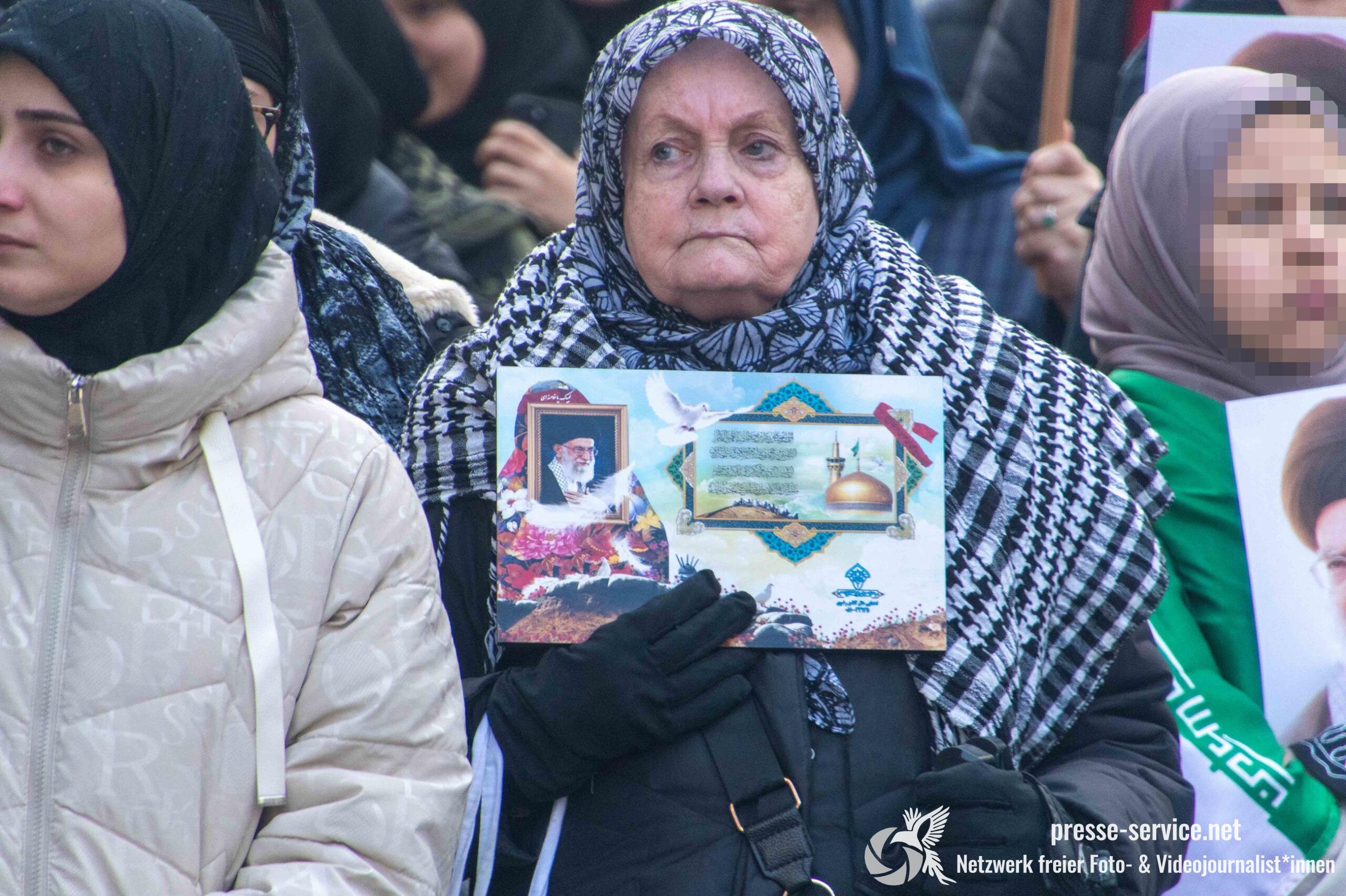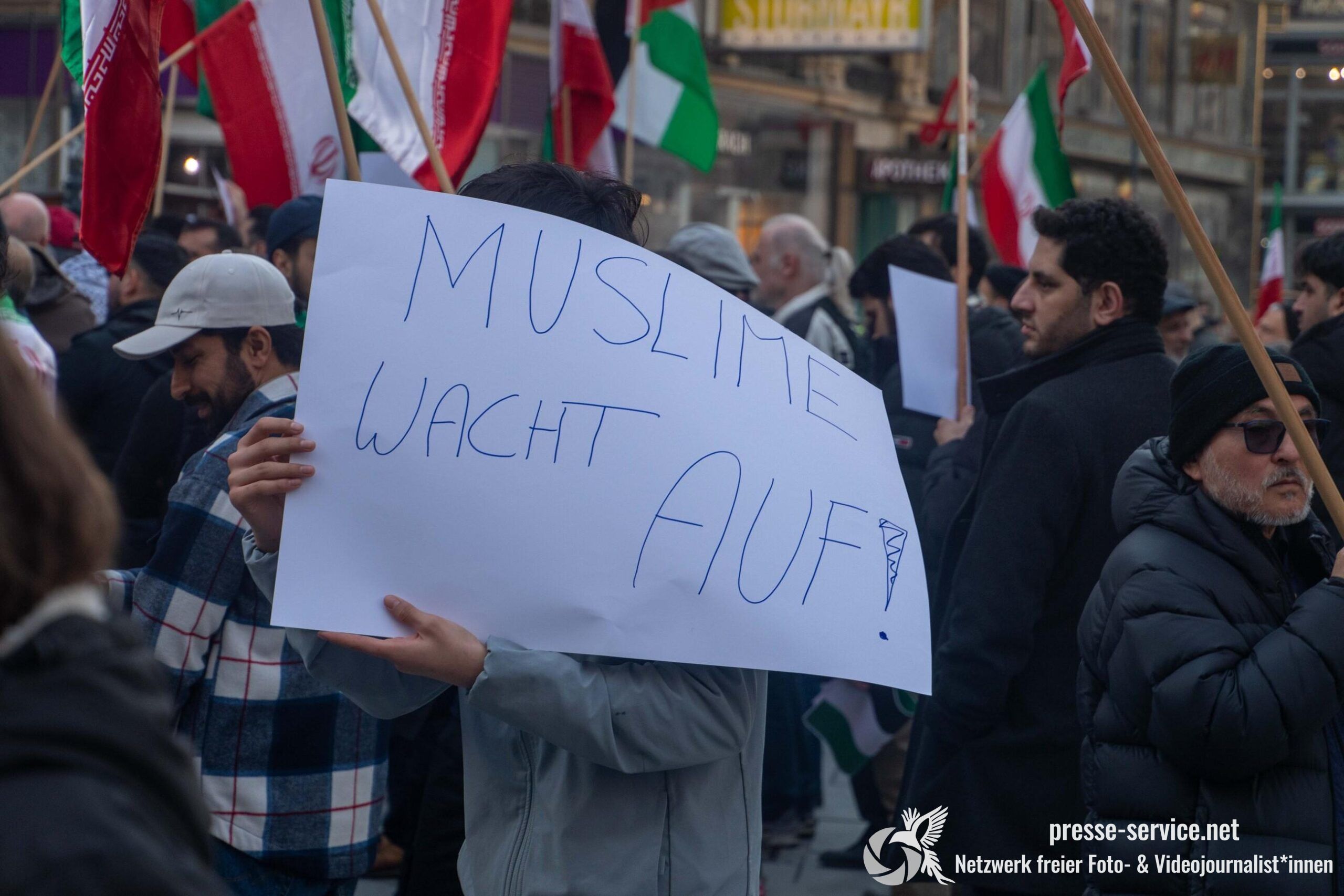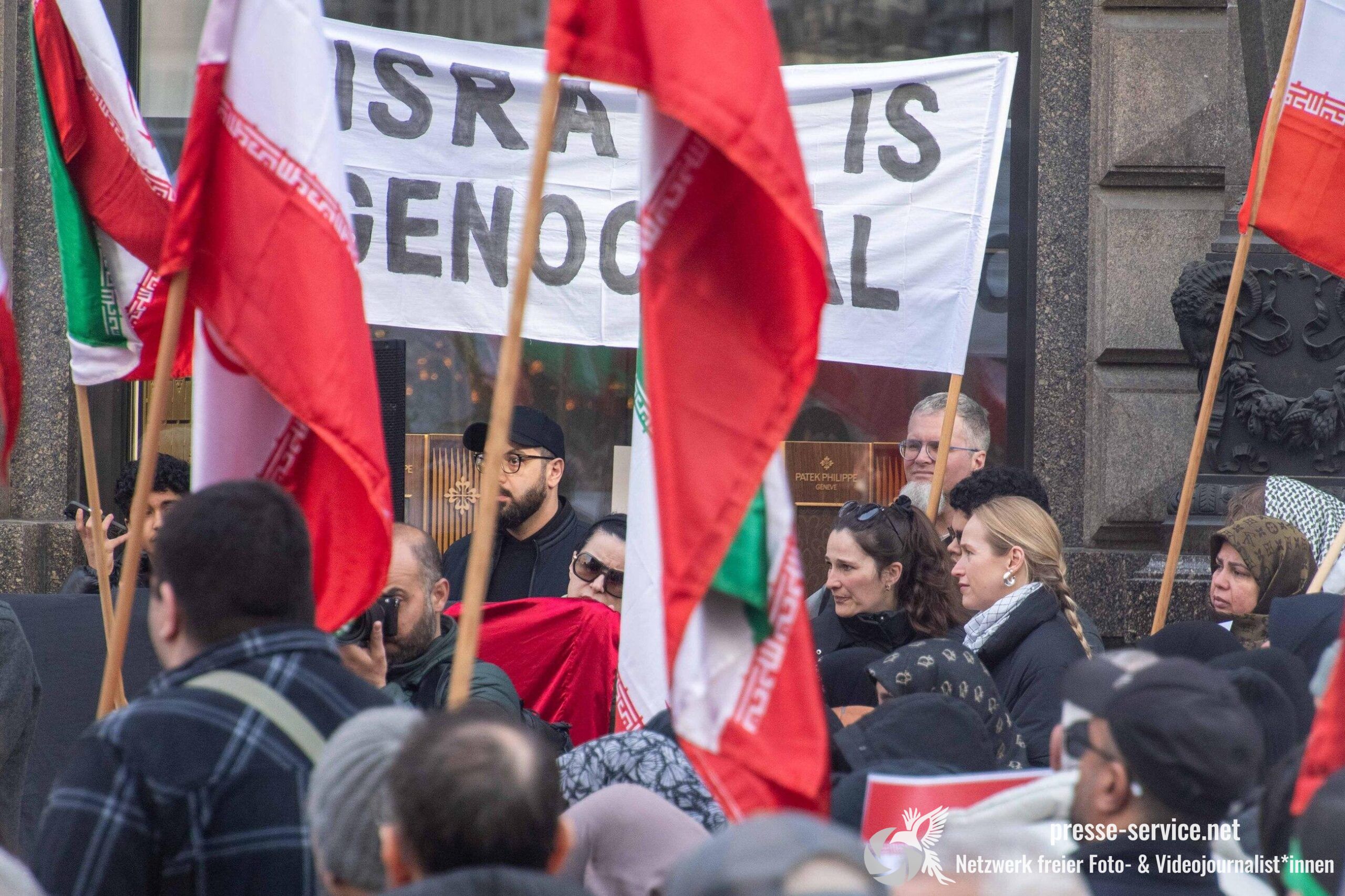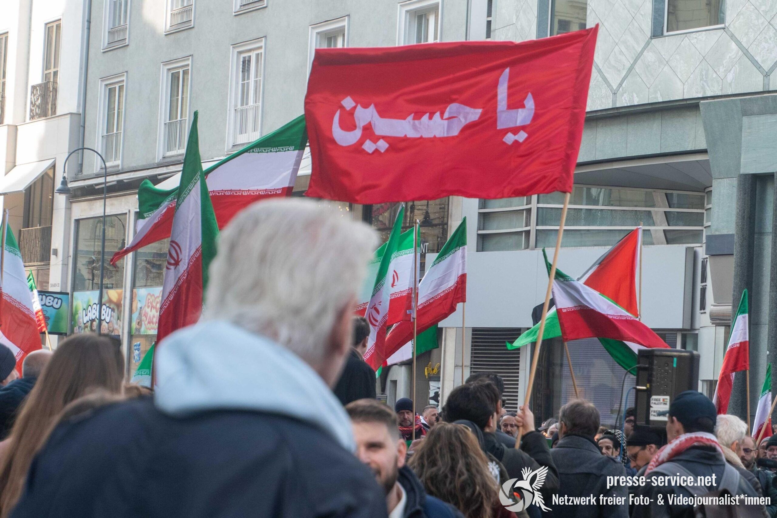 Auf der Kundgebung waren Fahnen der Islamischen Republik Iran sowie Portraits des am 28.02.2026 getöteten obersten Führers der Islamischen Republik Iran Ali Khamenei allgegenwärtig.